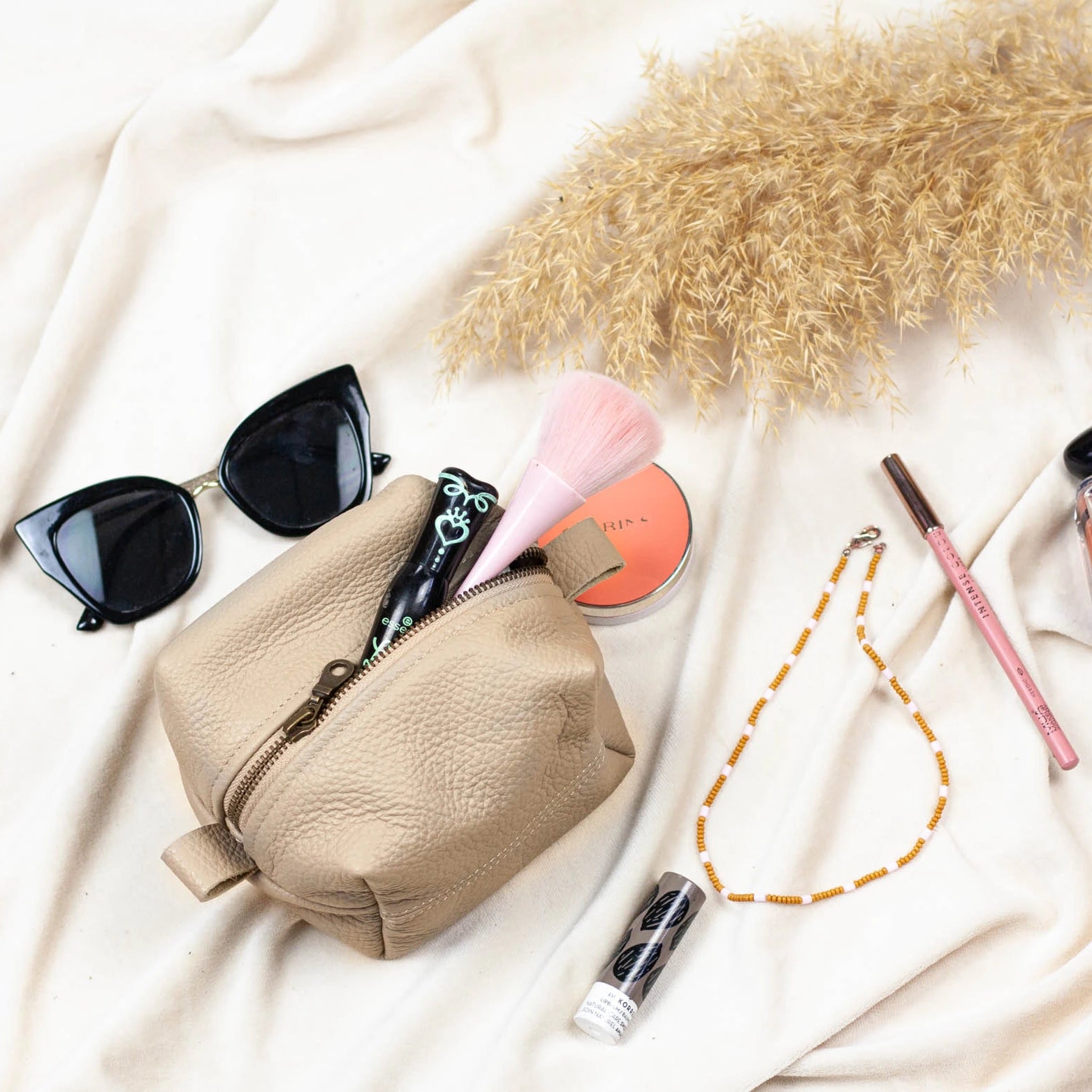 A sleek and compact leather cube pouch designed to stylishly store your everyday essentials.