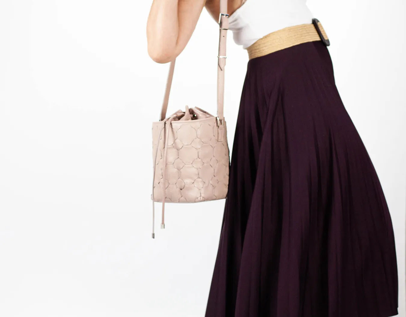 A square twist on the classic bucket bag—structured style meets drawstring charm