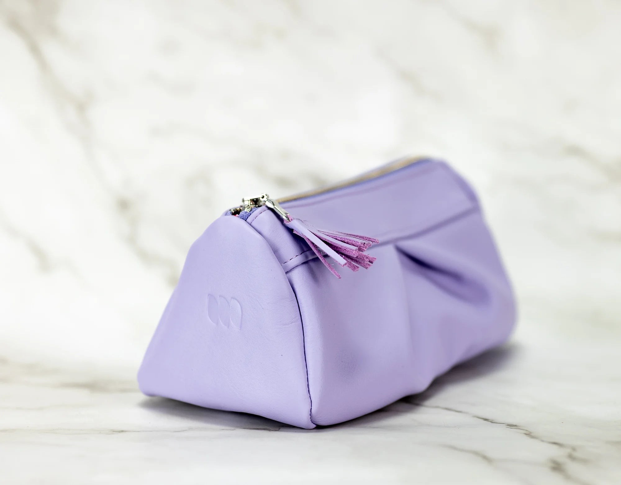 A compact leather pouch designed to stylishly store makeup, tech accessories, or everyday essentials